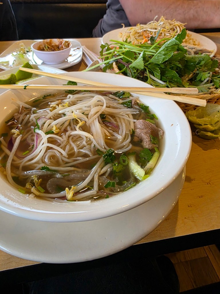 From classic pho options — including brisket, filet mignon, tendon, tripe, meatball, and oxtail — to vermicelli soups like Bún Bò Huế, the menu reflects regional Vietnamese influences.